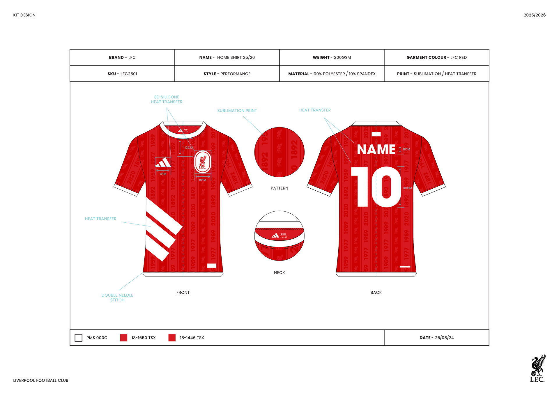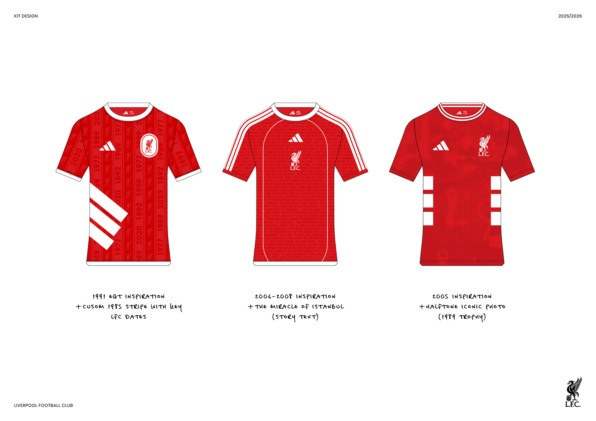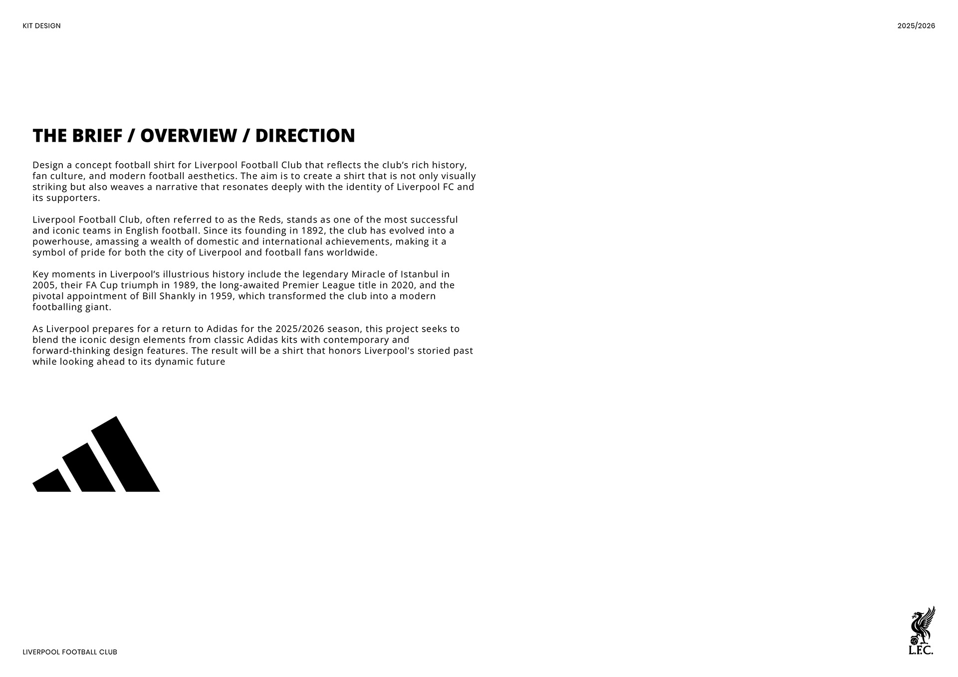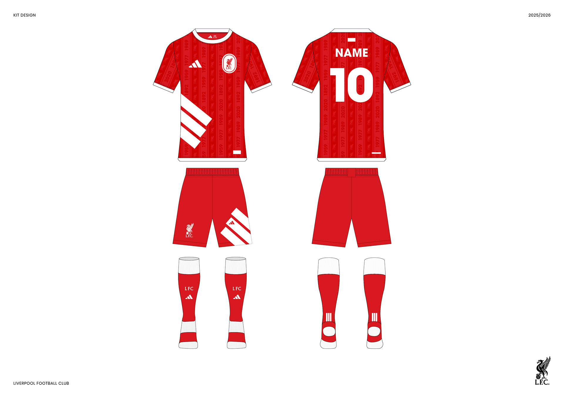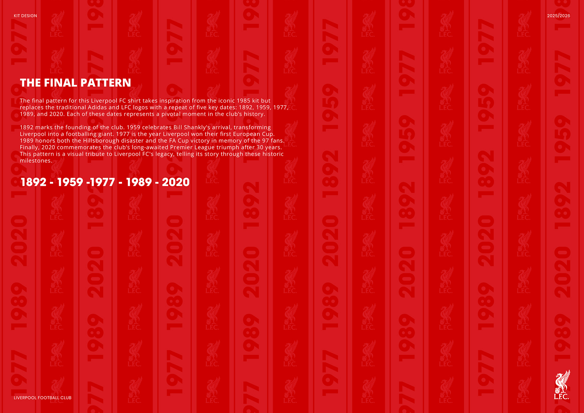 This project is purely conceptual and not officially affiliated with Adidas or Liverpool Football Club. It represents a personal passion project inspired by Liverpool’s history, assuming Adidas will be the kit sponsor for the 2025/2026 season. The design process began with detailed research into the club’s rich history, alongside a comprehensive review of past kit designs—both the successes and the missteps. This exploration helped identify which design elements best encapsulate Liverpool’s identity. After narrowing down the strongest influences, the final pattern was developed, incorporating five key dates—1892, 1959, 1977, 1989, and 2020—each representing pivotal moments in Liverpool’s journey. This kit design is a celebration of the club’s legacy, combining a modern aesthetic with a deep connection to its history. The result is a piece that balances tradition with innovation, crafted with careful attention to detail and storytelling.